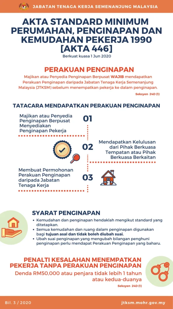 Berkuat kuasa sejak 1 Jun 2020, Akta Standard Minimum Perumahan, Penginapan dan Kemudahan Pekerja 1990 (Akta 446) merupakan undang-undang penting yang mengawal selia penyediaan penginapan pekerja di Malaysia.